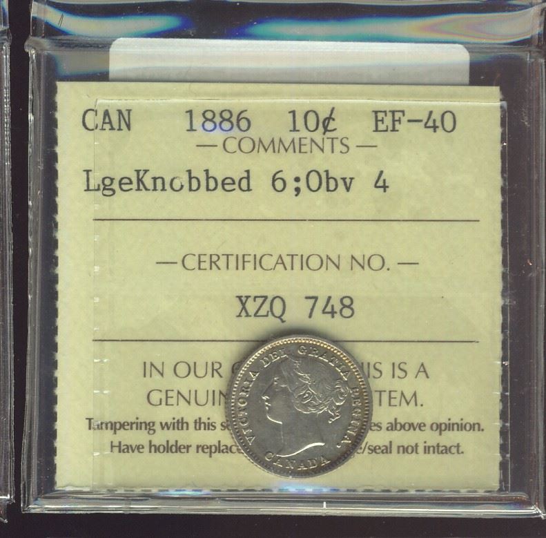 1886 10¢ LgeKnb 6; Obv 4 ICCS EF40.