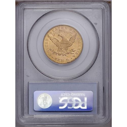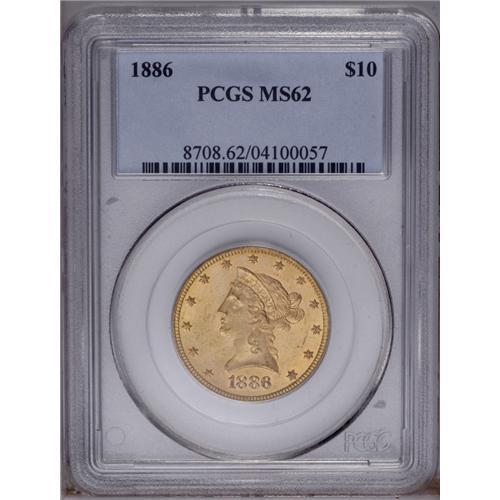 <B>1886<$10> MS62 PCGS.</B></I> A satiny representative with luminous apricot and olive-gray tones. Sharply struck, and less abraded than is customary for the grade.
