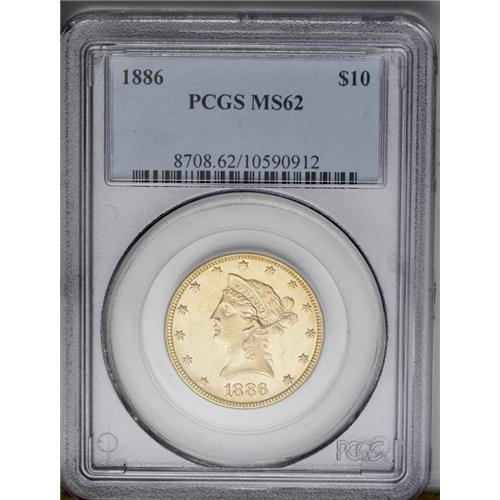 1886 $10 MS62 PCGS. Sharply struck, with bright peach- 1886