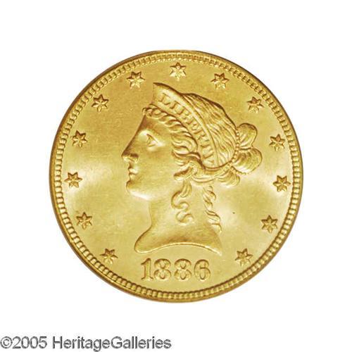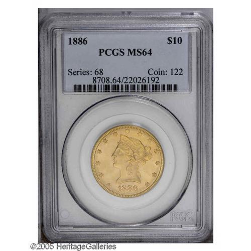 1886 $10 MS64 PCGS. The 1886 is scarce in Mint State, 1886[$10] MS64 PCGS.