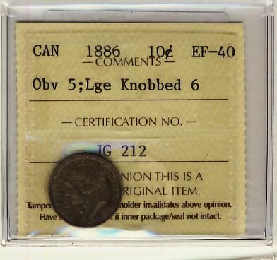 1886 10¢ Obv 5, Lg Knb 6 ICCS EF40.