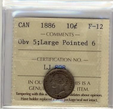 1886 10¢ Obv 5, Lg Ptd 6 ICCS F12.
