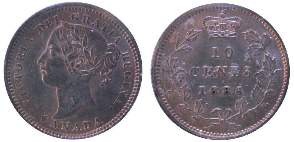 1886 10¢ Obv 5 repunched 6 ICCS MS64. Light golden toning. Excellent strike with clean fields and nice surfaces. Possibly the finest known.