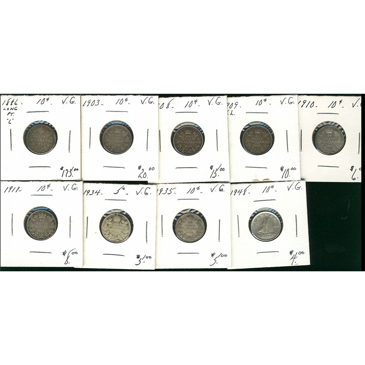 1886 10¢ Ptd, 1903, 1908, 1909VL, 1910, 1918, 1934, 1935 & 1948. Lot of 9 coins all VG. (PBA).