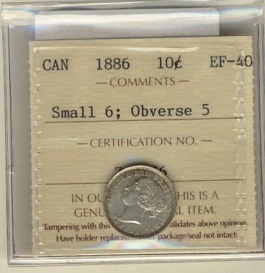 1886 10¢ Sml 6 Obv 5 ICCS EF40.