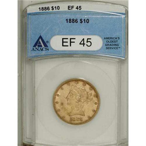 <B>1886 $10 XF45 ANACS.</B></I> NGC Census: (6/505). PCGS Population (9/373). Mintage: 236,160. Numismedia Wsl. Price for NGC/PCGS coin in XF45: $333. (#8708)<BR><BR><B>Coin Engraver:</B> Christian Gobrecht<BR><BR><b>Shipping:</b> Coins & Currency (<a target="_blank" href="http://www.heritageauctions.com/common/shipping.php">view shipping information</a>)