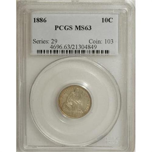 <B>1886 10C MS63 PCGS.</B></I> PCGS Population (106/200). NGC Census: (82/283). Mintage: 6,377,570. Numismedia Wsl. Price for NGC/PCGS coin in MS63: $200. (#4696)<BR><BR><B>Coin Engraver:</B> Christian Gobrecht<BR><BR><b>Shipping:</b> Coins & Currency (<a target="_blank" href="http://www.heritageauctions.com/common/shipping.php">view shipping information</a>)