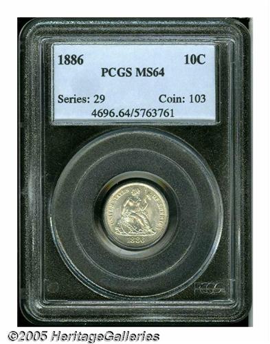 <B>1886<10C> MS64 PCGS.</B></I> Lustrous silver-gray surfaces are nearly untoned, and the design elements are well impressed. Portions of the reverse planchet have flaked off.