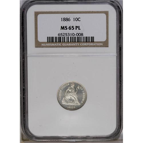 <B>1886<10C> MS65 Prooflike NGC.</B></I> Frosty devices demonstrate noticeable contrast with the flashy fields. This meticulously struck Gem has an undisturbed reverse and only unimportant obverse contact.