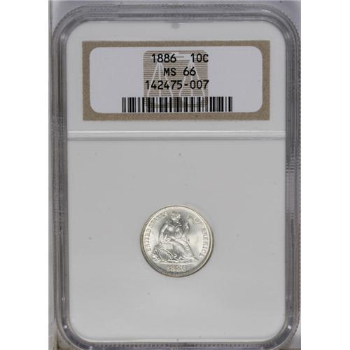 <B>1886<10C> MS66 NGC.</B></I> An intense frosty sheen illuminates the snow-white surfaces of this well struck Premium Gem. Wispy marks in the left obverse field prevent an even loftier grade designation. Census: 45 in 66, 8 finer (5/06).