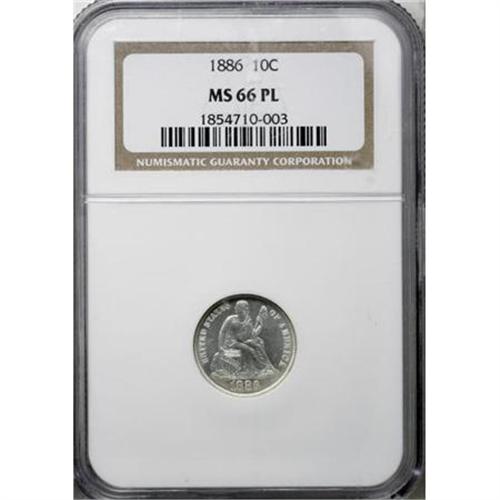 <B>1886 10C MS66 Prooflike NGC.</B></I> A lightly toned and noticeably reflective Premium Gem. A hint of gold patina near the date offsets the brilliance of the rest of the piece. This is the finest of only three Prooflike representatives certified by NGC (12/07).<BR><BR><B>Coin Engraver:</B> Christian Gobrecht<BR><BR><b>Shipping:</b> Coins & Currency (<a target="_blank" href="http://www.heritageauctions.com/common/shipping.php">view shipping information</a>)