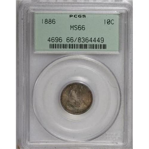 <B>1886 10C MS66 PCGS.</B></I> This well struck Premium Gem exhibits vibrant luster and colorful patina. Green-gold patina graces the margins, while the centers have opaque cloud-gray toning. The reverse shows a greater proportion of the latter. Population: 29 in 66, 7 finer (8/07).<BR><BR><B>Coin Engraver:</B> Christian Gobrecht<BR><BR><b>Shipping:</b> Coins & Currency (<a target="_blank" href="http://www.heritageauctions.com/common/shipping.php">view shipping information</a>)