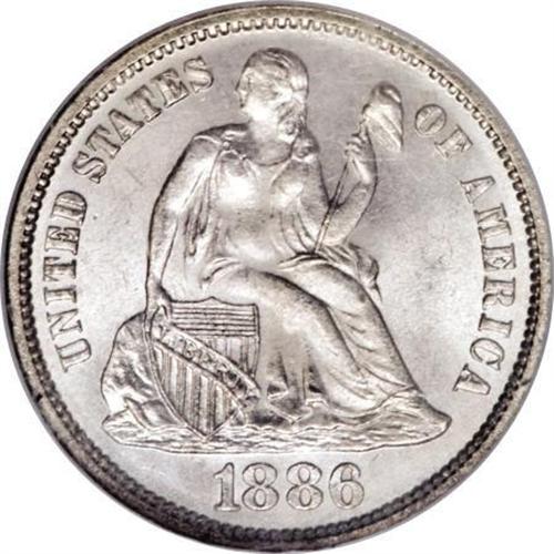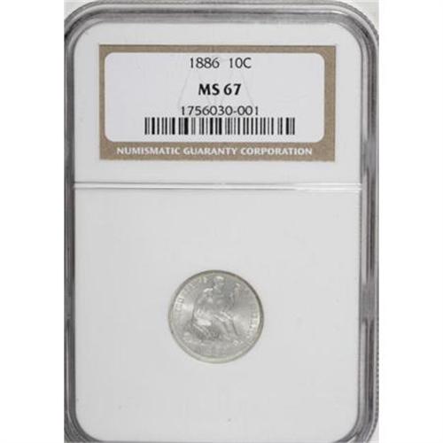 <B>1886 10C MS67 NGC.</B></I> Tied for the finest example certified by either NGC or PCGS, this Superb Gem has frosty silver surfaces with full mint brilliance. Both sides of this bright, untoned dime are fully detailed. The surfaces are pristine, and the eye appeal is fantastic. Census: 9 in 67, 0 finer (1/08).<BR><I>From The Southwest Collection.</B></I><BR><BR><B>Coin Engraver:</B> Christian Gobrecht<BR><BR><b>Shipping:</b> Coins & Currency (<a target="_blank" href="http://www.heritageauctions.com/common/shipping.php">view shipping information</a>)