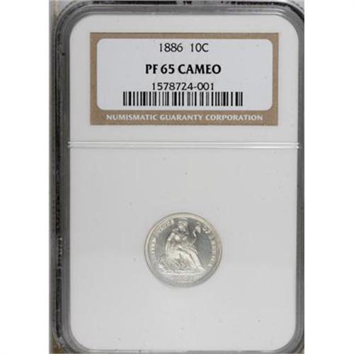 <B>1886 10C PR65 Cameo NGC.</B></I> The watery fields and richly frosted devices are untoned and free of troublesome distractions. The devices are well produced, except for some weakness on the top of Liberty's head. Conditionally scarce with the Cameo designation. Census: 5 in 65 Cameo, 18 finer (9/07). <BR><BR><b>Shipping:</b> Coins & Currency (<a target="_blank" href="http://www.heritageauctions.com/common/shipping.php">view shipping information</a>)