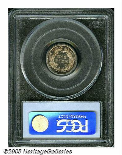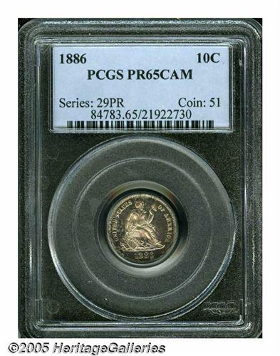 <B>1886<10C> PR65 Cameo PCGS.</B></I> One of only 886 proofs produced this year; however, very few high grade examples were set aside. This is a sparkling, sharply contrasted example that is bathed with dappled pale purple toning. The design features are well executed. Population: 6 in 65, 3 finer (4/05).