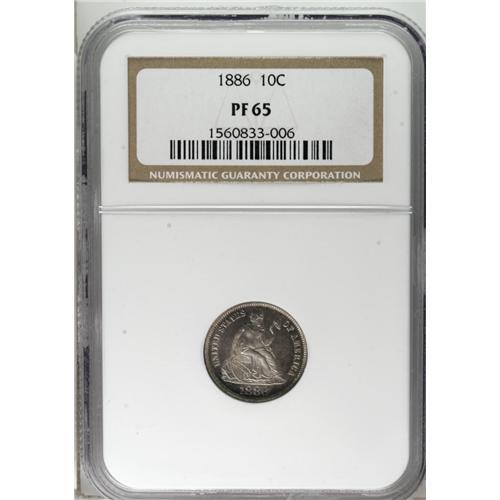 1886 10C PR65 NGC. The smooth, mildly reflective surfa