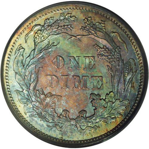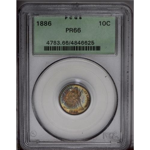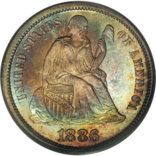 <B>1886<10C> PR66 PCGS.</B></I> Crisply detailed except for the top of Liberty's head, with lavish multicolored toning over both sides and well preserved, unmarked surfaces. Each side remains quite reflective, despite the rich patina. Population: 17 in 66, 4 finer (3/06).
