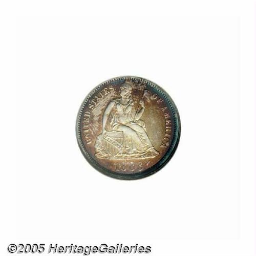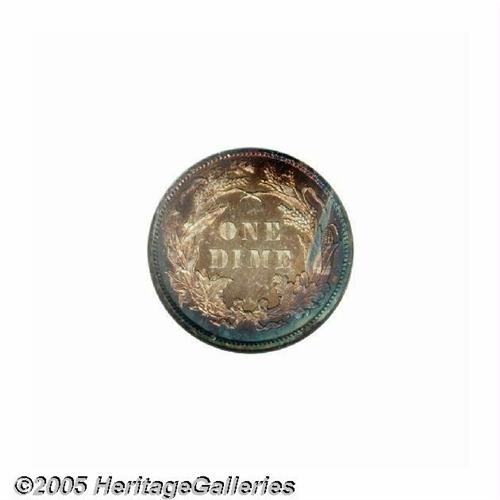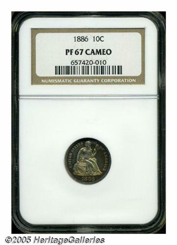 <B>1886<10C> PR67 Cameo NGC.</B></I> An eye-stopping example for the collector of originally toned coins. Attractive moderately toned surfaces of crimson-orange, cobalt-blue, and purple-red are seen on both obverse and reverse. The original reflectivity is plainly visible and accents the coloration. A truly beautiful Superb Gem proof.
