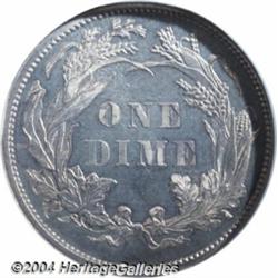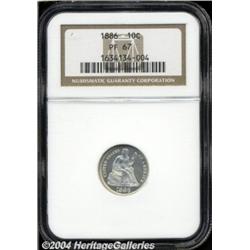 <B>1886<10C> PR67 NGC.</B></I> Whereas the obverse is untoned, the reverse displays an even endowment of golden-gray patina. The reflective finish and smooth, virtually pristine features are readily evident after even the most casual glance. Fully struck save for a little light softness of detail over the top of Liberty's head. Conditionally rare, and perfect for inclusion in a stellar quality proof type set. Population: 13 in 67, there are no coins finer at either major grading service (7/04). <BR><BR><B>Important notice:</B> Heritage usually auctions material at the rate of 200-250 lots per hour. On some occasions eBay Live bid software or the Internet may not be able to keep up with the pace of the auction. We recommend placing a realistic absentee bid now as insurance to avoid disappointment. Occasionally the auctioneer may eliminate or reject an eBay Live bid, and the auctioneer may also reopen a lot after the close of the eBay live bidding (usually because we missed an audience bid), and may reject your bid even if it shows you as the winning bidder. By bidding via eBay Live, you agree that Heritage may award the lot to another bidder at its sole discretion under the circumstances described above or any other reasonable circumstances. Since eBay bids are not shown to us until we open the lot on the floor, we treat those bids just like floor bids. In most cases the floor responds before the eBay bid is presented to us, due to Internet lag time, so for consistency we have made it a policy that floor bids are always considered first over tie eBay live bids. Also please note that all Heritage lots purchased through eBay Live carry a 20% Buyer's Premium. Please make sure you read the Terms and Conditions before you bid. </span></font></tr></table></td></tr></table>