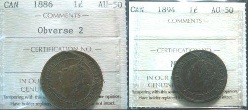 1886 & 1894 1¢ both ICCS AU50. Lot of two coins both without comments.