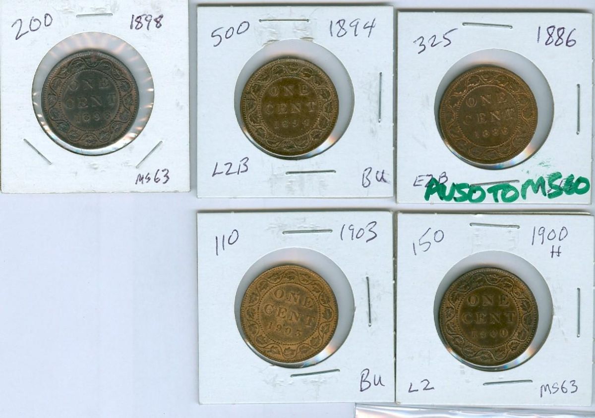 1886, 1894, 1898H , 1900H & 1903 1¢. Lot of 5 coins all AU to UNC with lustre and trace red. Should be Viewed.