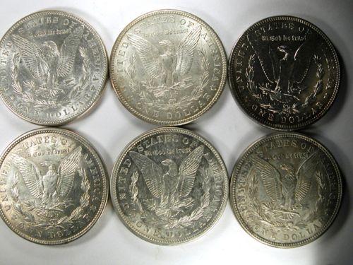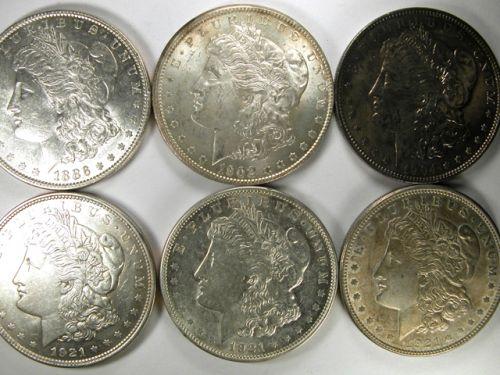 Morgan Dollars 1886, 1902O, 1904O and 1921 three pieces. Total six pale toned and lightly toned pieces, all AU and Uncirculated