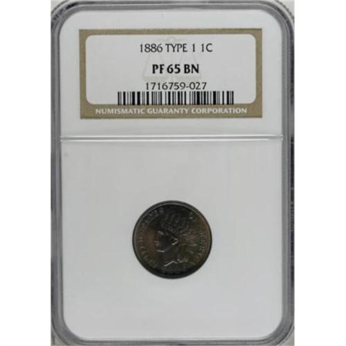 <B>1886 1C Type One PR65 Brown NGC.</B></I> NGC Census: (58/36). PCGS Population (34/17). Mintage: 4,290. Numismedia Wsl. Price for NGC/PCGS coin in PR65: $400. (#2345)<BR><BR><B>Coin Engraver:</B> James B. Longacre<BR><BR><b>Shipping:</b> Coins & Currency (<a target="_blank" href="http://www.heritageauctions.com/common/shipping.php">view shipping information</a>)