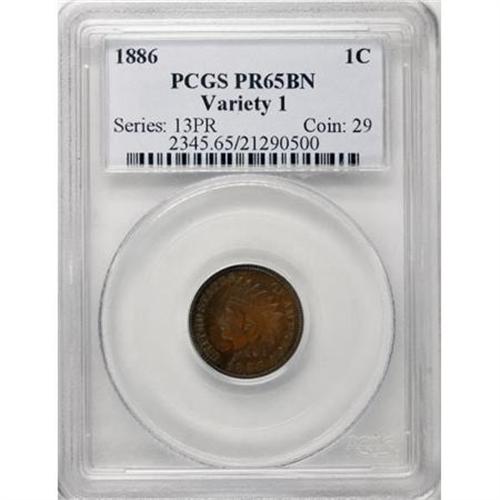 <B>1886 1C Type One PR65 Brown PCGS.</B></I> . PCGS Population (34/17). NGC Census: (58/36). Mintage: 4,290. Numismedia Wsl. Price for NGC/PCGS coin in PR65: $400. (#2345)<BR><BR><B>Coin Engraver:</B> James B. Longacre<BR><BR><b>Shipping:</b> Coins & Currency (<a target="_blank" href="http://www.heritageauctions.com/common/shipping.php">view shipping information</a>)