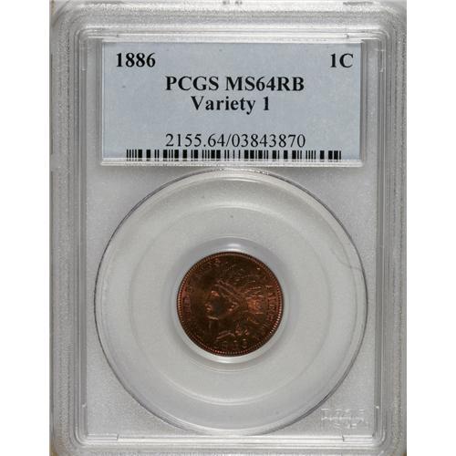 <B>1886 1C Type One MS64 Red and Brown PCGS.</B></I> PCGS Population (107/0). NGC Census: (82/54). Mintage: 17,654,290. Numismedia Wsl. Price for NGC/PCGS coin in MS64: $360. (#2155)<BR><BR><b>Shipping:</b> Coins & Currency (<a target="_blank" href="http://www.heritageauctions.com/common/shipping.php">view shipping information</a>)