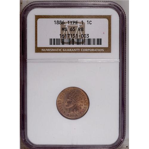 <B>1886<1C> Type One MS65 Red and Brown NGC.</B></I> Snow-1, the 6 is repunched. This sharply struck Gem features an orange-gold obverse and slightly deeper apricot-tan hues on the reverse. The absence of relevant carbon or contact provides impressive eye appeal.