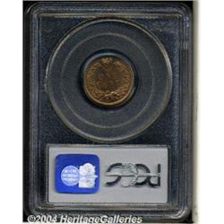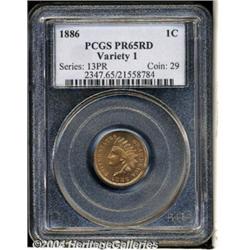 <B>1886<1C> Type One PR65 Red PCGS.</B></I> Even though 4,290 proof Cents were struck in 1886, only 1,800 pieces were of the Type One variety. This piece has deep, glassy fields and the surfaces display bright orange-gold coloration with an occasional dab of deeper red over the top of the obverse. An exceptionally well preserved specimen worthy of any fine collection. Population: 17 in 65, 10 finer (3/04). <BR><BR><B>Important notice:</B> Heritage usually auctions material at the rate of 200-250 lots per hour. On some occasions eBay Live bid software or the Internet may not be able to keep up with the pace of the auction. We recommend placing a realistic absentee bid now as insurance to avoid disappointment. Occasionally the auctioneer may eliminate or reject an eBay Live bid, and the auctioneer may also reopen a lot after the close of the eBay live bidding (usually because we missed an audience bid), and may reject your bid even if it shows you as the winning bidder. By bidding via eBay Live, you agree that Heritage may award the lot to another bidder at its sole discretion under the circumstances described above or any other reasonable circumstances. Since eBay bids are not shown to us until we open the lot on the floor, we treat those bids just like floor bids. In most cases the floor responds before the eBay bid is presented to us, due to Internet lag time, so for consistency we have made it a policy that floor bids are always considered first over tie eBay live bids. Also please note that all Heritage lots purchased through eBay Live carry a 20% Buyer's Premium. Please make sure you read the Terms and Conditions before you bid.