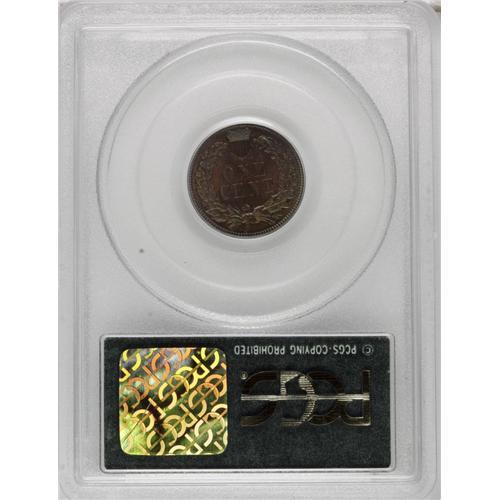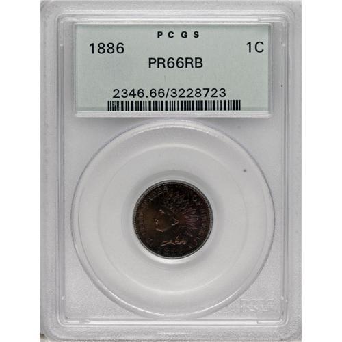 <B>1886 1C Type One PR66 Red and Brown PCGS.</B></I> A needle-sharp Gem with iridescent apple-green and ruby-red toning. The lowest headdress feather points between the IC in AMERICA on the more available Type One variety, while the feather points between CA on the scarcer Type Two. In a green label holder. Population: 26 in 66 Red and Brown, 2 finer (3/07).<BR><BR><b>Shipping:</b> Coins & Currency (<a target="_blank" href="http://www.heritageauctions.com/common/shipping.php">view shipping information</a>)