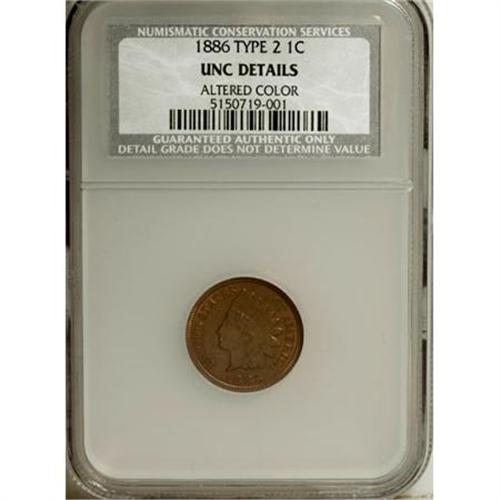 <B>1886 1C Type Two--Altered Color--NCS. UNC Details.</B></I> NGC Census: (0/0). PCGS Population (0/0). (#92154)<BR><BR><B>Coin Engraver:</B> James B. Longacre<BR><BR><b>Shipping:</b> Coins & Currency (<a target="_blank" href="http://www.heritageauctions.com/common/shipping.php">view shipping information</a>)