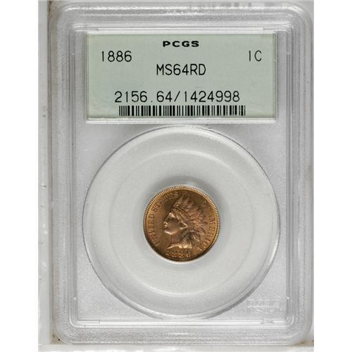 <B>1886<1C> Type Two MS64 Red PCGS.</B></I> Solidly struck with vivid orange-copper color accented with cherry-red on the devices. Minimally marked, though a fingerprint appears on the Indian's neck. Housed in a green label holder. The mintage of the semi-key 1886 Type Two is unknown, although it is clearly scarcer than its Type One counterpart. Population: 27 in 64 Red, 8 finer (8/06).