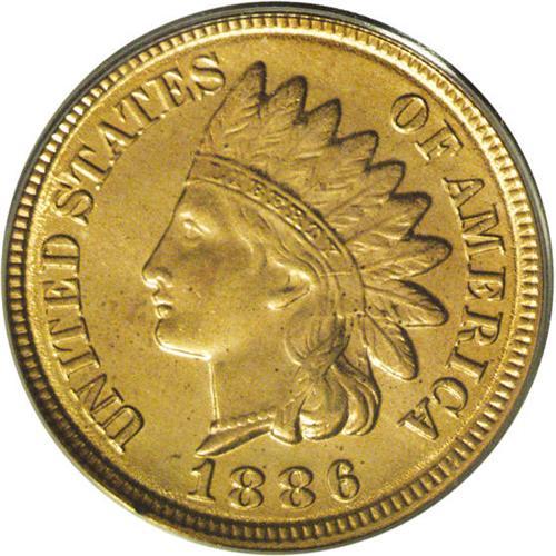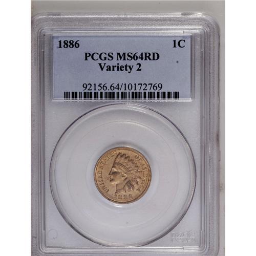 <B>1886<1C> Type Two MS64 Red PCGS.</B></I> The last feather of the headdress points between the C and the A of AMERICA on this variety. Only about 50 Red Uncirculated pieces have been certified by PCGS and NGC. This near-Gem displays bright copper-orange luster dotted by some light flecks. The design elements are well impressed, and include nearly full definition on all four diamonds. A handful of minute, inoffensive marks are noted on the obverse. Population: 27 in 64, 8 finer (6/06).