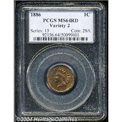 <B>1886<1C> Type Two MS64 Red PCGS.</B></I> An attractive full red example of this scarcer issue from 1886. Well struck, the surfaces exude a warm, cherry-red color with the only noticeable defect being a spot over the middle of the E in ONE. Population: 25 in 64, 8 finer (9/04). <BR><BR><B>Important notice:</B> Heritage usually auctions material at the rate of 200-250 lots per hour. On some occasions eBay Live bid software or the Internet may not be able to keep up with the pace of the auction. We recommend placing a realistic absentee bid now as insurance to avoid disappointment. Occasionally the auctioneer may eliminate or reject an eBay Live bid, and the auctioneer may also reopen a lot after the close of the eBay live bidding (usually because we missed an audience bid), and may reject your bid even if it shows you as the winning bidder. By bidding via eBay Live, you agree that Heritage may award the lot to another bidder at its sole discretion under the circumstances described above or any other reasonable circumstances. Since eBay bids are not shown to us until we open the lot on the floor, we treat those bids just like floor bids. In most cases the floor responds before the eBay bid is presented to us, due to Internet lag time, so for consistency we have made it a policy that floor bids are always considered first over tie eBay live bids. Also please note that all Heritage lots purchased through eBay Live carry a 20% Buyer's Premium. Please make sure you read the Terms and Conditions before you bid.