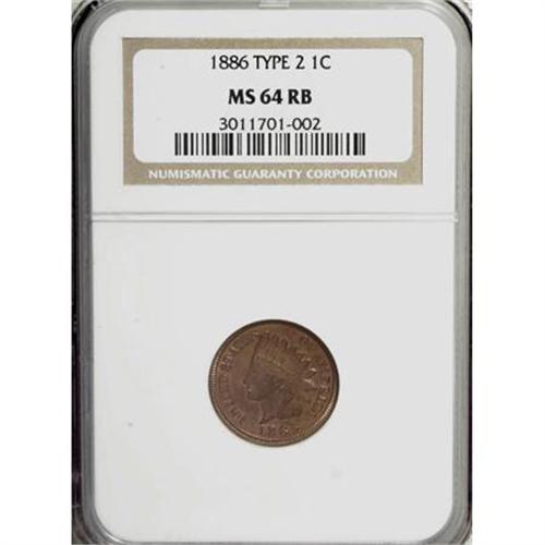 <B>1886 1C Type Two MS64 Red and Brown NGC.</B></I> Traces of lilac and blue toning subdue the brilliant orange mint surfaces of this piece, only sufficiently to prevent a Red designation.<BR><BR><b>Shipping:</b> Coins & Currency (<a target="_blank" href="http://www.heritageauctions.com/common/shipping.php">view shipping information</a>)