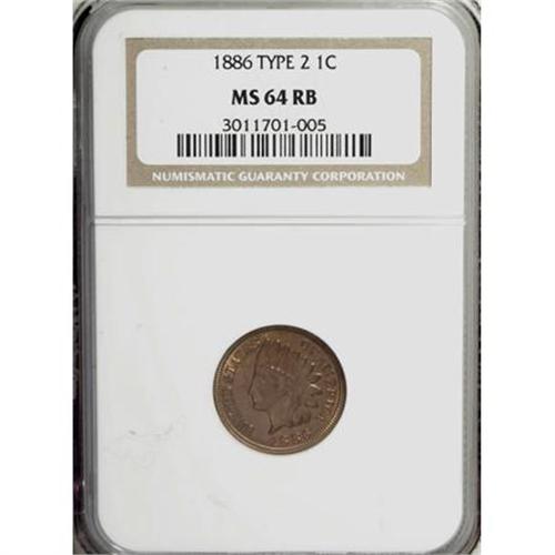 <B>1886 1C Type Two MS64 Red and Brown NGC.</B></I> The satiny deep orange and brown appearance of this piece is typical of the 1886 Type Two cents. The details are generally a bit soft but the strike of this one is sharper than usual.<BR><BR><b>Shipping:</b> Coins & Currency (<a target="_blank" href="http://www.heritageauctions.com/common/shipping.php">view shipping information</a>)