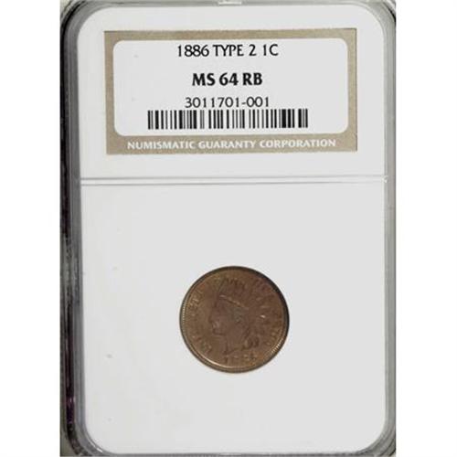 <B>1886 1C Type Two MS64 Red and Brown NGC.</B></I> A sharp strike and considerable original red luster are accompanied by lilac and pale brown toning on each side. Mint State 1886 Type Two Indian cents are much scarcer than Type One pieces.<BR><BR><b>Shipping:</b> Coins & Currency (<a target="_blank" href="http://www.heritageauctions.com/common/shipping.php">view shipping information</a>)