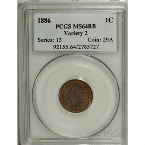 <B>1886 1C Type Two MS64 Red and Brown PCGS.</B></I> Moderately frosty in texture, both sides are powerfully impressed with no singularly bothersome abrasions. The deep red-brown and violet toning is highly attractive. A couple of small marks on the obverse limit the grade. Population: 93 in 64 Red and Brown, 16 finer (6/07). <BR><BR><b>Shipping:</b> Coins & Currency (<a target="_blank" href="http://www.heritageauctions.com/common/shipping.php">view shipping information</a>)