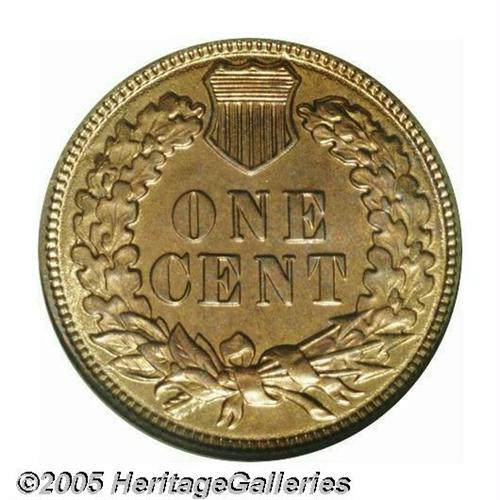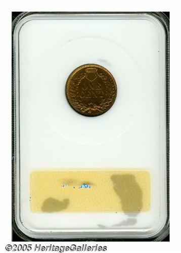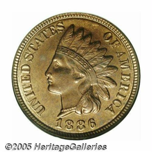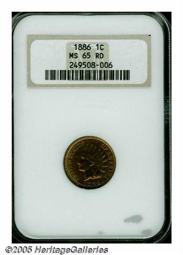 <B>1886<1C> Type Two MS65 Red NGC.</B></I> The Mint introduced yet another new hub to the Indian Cent series in 1886. The obverse portrait is proportioned differently and rotated slightly clockwise in relation to that on the Type One hub. The most significant change, however, is the position of the final feather in Liberty's headdress to the letters in AMERICA. On Type One examples, that feather points between the IC in AMERICA, while on Type Two examples it points between the CA. Writing in 1992, Snow relates that many Mint State 1886 Type Two Cents are extant from an original roll. Most of these coins are softly struck from worn dies. One should not overlook the fact, however, that the Type Two is significantly scarcer than its similarly dated Type One counterpart. Both sides are a little softly defined, but, while the dies do appear to have been worn at the time of striking, we do not know whether or not this coin was once included in the aforementioned roll. A few swirls of subdued color are seen on the obverse, but fulsome orange-red luster dominates the outward appearance. Clearly, this is a coin that represents a fleeting opportunity for the advanced collector. Population: 10 in 65, 1 finer (3/05).