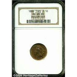 <B>1886<1C> Type Two MS65 Red NGC.</B></I> Many of the Mint State Type Two coins that are known today come from an original roll that was dispersed years ago. Most of these coins were struck from worn dies. This is such a later die state example, and the surfaces display rich, cherry-red color on both sides with a light overlay of crimson-tan over the devices. Well struck with evidence of slight die clashing in the fields. Population: 7 in 65, 1 finer (9/04). <BR><BR><B>Important notice:</B> Heritage usually auctions material at the rate of 200-250 lots per hour. On some occasions eBay Live bid software or the Internet may not be able to keep up with the pace of the auction. We recommend placing a realistic absentee bid now as insurance to avoid disappointment. Occasionally the auctioneer may eliminate or reject an eBay Live bid, and the auctioneer may also reopen a lot after the close of the eBay live bidding (usually because we missed an audience bid), and may reject your bid even if it shows you as the winning bidder. By bidding via eBay Live, you agree that Heritage may award the lot to another bidder at its sole discretion under the circumstances described above or any other reasonable circumstances. Since eBay bids are not shown to us until we open the lot on the floor, we treat those bids just like floor bids. In most cases the floor responds before the eBay bid is presented to us, due to Internet lag time, so for consistency we have made it a policy that floor bids are always considered first over tie eBay live bids. Also please note that all Heritage lots purchased through eBay Live carry a 20% Buyer's Premium. Please make sure you read the Terms and Conditions before you bid.