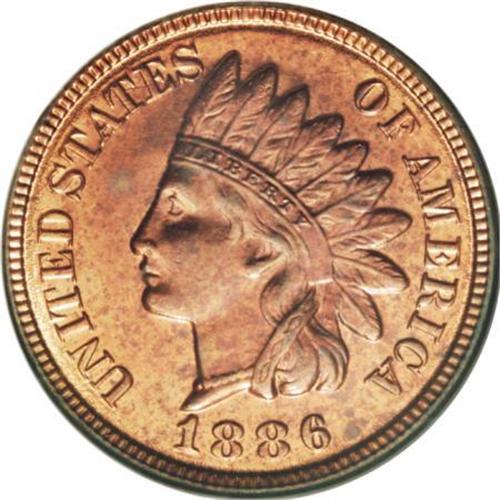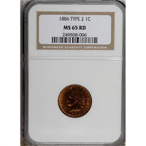 <B>1886 1C Type Two MS65 Red NGC.</B></I> The Mint introduced yet another new hub to the Indian Cent series in 1886. The obverse portrait is proportioned differently and rotated slightly clockwise in relation to that on the Type One hub. The most significant change, however, is the position of the final feather in Liberty's headdress to the letters in AMERICA. On Type One examples, that feather points between the IC in AMERICA, while on Type Two examples it points between the CA. Writing in 1992, Snow relates that many Mint State 1886 Type Two cents are extant from an original roll. Most of these coins are softly struck from worn dies. One should not overlook the fact, however, that the Type Two is significantly scarcer than its similarly dated Type One counterpart. The present Gem is one of only 15 pieces graded MS65 Red by NGC and PCGS combined, and there are just two coins finer (10/07). Both sides are a little softly defined, but, while the dies do appear to have been worn at the time of striking, we do not know whether or not this coin was once included in the aforementioned roll. A few swirls of subdued color are seen on the obverse, but fulsome orange-red luster dominates the outward appearance. Clearly, this is a coin that represents a fleeting opportunity for the advanced collector.<BR><BR><BR><B>Coin Engraver:</B> James B. Longacre<BR><BR><b>Shipping:</b> Coins & Currency (<a target="_blank" href="http://www.heritageauctions.com/common/shipping.php">view shipping information</a>)