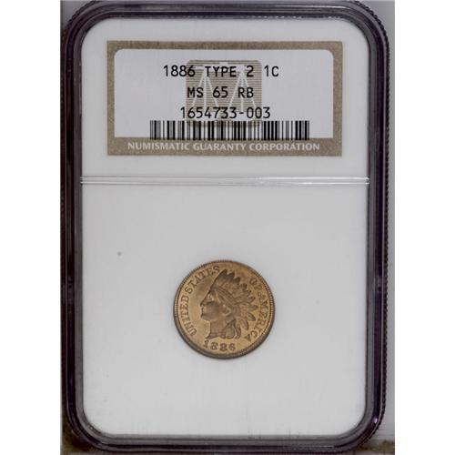 <B>1886<1C> Type Two MS65 Red and Brown NGC.</B></I> The Type Two 1886 cent is considered the scarcer of the two varieties used that year. The hub was changed causing the last feather to point down between the CA of AMERICA and was used from this time through the final production in 1909. The rich red color is slightly muted resulting in the Red and Brown color designation from NGC. Well struck with smooth surfaces and just a little scattered carbon flecking on the reverse. Census: 33 in 65, 1 finer (3/06). <BR><BR><B>Important notice:</B> Heritage usually auctions material at the rate of 200-250 lots per hour. On some occasions eBay Live bid software or the Internet may not be able to keep up with the pace of the auction. We recommend placing a realistic absentee bid now as insurance to avoid disappointment. Occasionally the auctioneer may eliminate or reject an eBay Live bid, and the auctioneer may also reopen a lot after the close of the eBay live bidding (usually because we missed an audience bid), and may reject your bid even if it shows you as the winning bidder. By bidding via eBay Live, you agree that Heritage may award the lot to another bidder at its sole discretion under the circumstances described above or any other reasonable circumstances. Since eBay bids are not shown to us until we open the lot on the floor, we treat those bids just like floor bids. In most cases the floor responds before the eBay bid is presented to us, due to Internet lag time, so for consistency we have made it a policy that floor bids are always considered first over tie eBay live bids. Also please note that all Heritage lots purchased through eBay Live carry a 20% Buyer's Premium. Please make sure you read the Terms and Conditions before you bid. This lot is being auctioned in conjunction with a live floor auction by Heritage Galleries & Auctioneers. All final auction and invoice information will be supplied by Heritage Galleries & Auctioneers, and all other information should be considered preliminary. Lot:403 <BR><BR><B>Winning Notification and Billing:</B> After the FINAL session in this auction is complete, Heritage will send e-mail and snail mail invoices. This process normally takes several days. All final auction and invoice information will be supplied by Heritage Galleries & Auctioneers, and all other information should be considered preliminary. <BR><BR>This auction will be conducted on a live auction floor and over the Internet through eBay Live. If you choose to place an absentee bid, please take a moment to <font color='#0000ff'><u><a href='http://pages.ebay.com/liveauctions/help/before/laabsentee.html'>learn how eBay Live absentee bidding works</a></u></font><font color='#000000'>