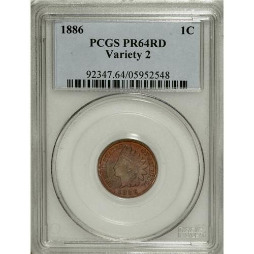 <B>1886 1C Type Two PR64 Red PCGS.</B></I> The scarcer of the two types from 1886, this variant shows the last feather in the headdress pointing between the C and A in AMERICA, rather than between the I and C on the previous Type One coins. Full Red coins are difficult indeed and worth a large premium. This deep cherry-red example shows slight blue mellowing in the center of the obverse. A pleasing, problem-free proof with no obvious or mentionable contact marks. Population: 9 in 64, 3 finer (3/07).<BR><BR><b>Shipping:</b> Coins & Currency (<a target="_blank" href="http://www.heritageauctions.com/common/shipping.php">view shipping information</a>)