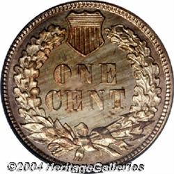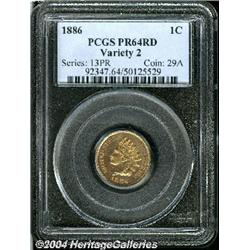 <B>1886<1C> Type Two PR64 Red PCGS.</B></I> Of the greatest rarity and importance to Indian cent collectors, the Type Two 1886 is very rarely encountered with full red color. Special mention should be made regarding this as most original Type Twos show a "straw color" that is peculiar to this issue and the 1887. This coin certainly displays that unusual, bright coloration and is also lightly streaked on the reverse with the red coloration seen on other dates in the series. Bright and deeply reflective with no mentionable contact marks on either side, in spite of the less-than-Gem designation. Population: 9 in 64, 3 finer (9/04). <BR><BR><B>Important notice:</B> Heritage usually auctions material at the rate of 200-250 lots per hour. On some occasions eBay Live bid software or the Internet may not be able to keep up with the pace of the auction. We recommend placing a realistic absentee bid now as insurance to avoid disappointment. Occasionally the auctioneer may eliminate or reject an eBay Live bid, and the auctioneer may also reopen a lot after the close of the eBay live bidding (usually because we missed an audience bid), and may reject your bid even if it shows you as the winning bidder. By bidding via eBay Live, you agree that Heritage may award the lot to another bidder at its sole discretion under the circumstances described above or any other reasonable circumstances. Since eBay bids are not shown to us until we open the lot on the floor, we treat those bids just like floor bids. In most cases the floor responds before the eBay bid is presented to us, due to Internet lag time, so for consistency we have made it a policy that floor bids are always considered first over tie eBay live bids. Also please note that all Heritage lots purchased through eBay Live carry a 20% Buyer's Premium. Please make sure you read the Terms and Conditions before you bid.