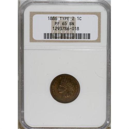 <B>1886 1C Type Two PR65 Brown NGC.</B></I> Rich plum-red, gold, and olive embrace this sharply struck and unblemished Gem. The Type Two features a feather tip between the CA in AMERICA, and is the key to the post-1877 proof series.<BR><BR><b>Shipping:</b> Coins & Currency (<a target="_blank" href="http://www.heritageauctions.com/common/shipping.php">view shipping information</a>)