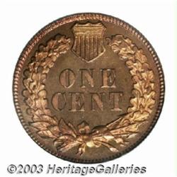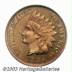 1886 1C Type Two PR65 Red Cameo PCGS. Type Two examples, such as the present Gem, show the lowest feather in Liberty's headdress pointing between the CA in AMERICA. On Type One specimens, this feather points between the IC in AMERICA. Warm autumn-orange and red color accents the expertly preserved surfaces, and every feature is boldly defined. A unique opportunity for the advanced Indian cent specialist.From the Palm Beach Collection. Important notice: Heritage usually auctions material at the rate of 200-250 lots per hour. On some occasions eBay Live bid software or the Internet may not be able to keep up with the pace of the auction. We recommend placing a realistic absentee bid now as insurance to avoid disappointment. Occasionally the auctioneer may eliminate or reject an eBay Live bid, and the auctioneer may also reopen a lot after the close of the eBay live bidding (usually because we missed an audience bid), and may reject your bid even if it shows you as the winning bidder. By bidding via eBay Live, you agree that Heritage may award the lot to another bidder at its sole discretion under the circumstances described above or any other reasonable circumstances. Also please note that all Heritage lots purchased through eBay Live carry a 20% Buyer's Premium. Please make sure you read the Terms and Conditions before you bid.