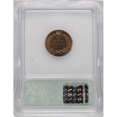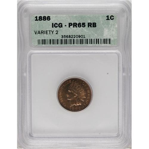 <B>1886 1C Type Two PR65 Red and Brown ICG.</B></I> Much rarer than its Type One counterpart, the 1886 Type Two has the lowest feather pointing between CA rather than IC in AMERICA. The fields are golden-bronze with a tinge of magenta, but some tan-brown visits the highpoints, and notable contrast is seen on each side. A small, curving strikethrough is observed in the left obverse field.<BR><BR><b>Shipping:</b> Coins & Currency (<a target="_blank" href="http://www.heritageauctions.com/common/shipping.php">view shipping information</a>)