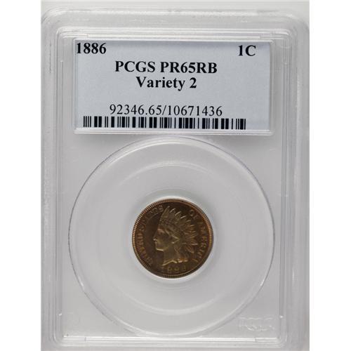 <B>1886<1C> Type Two PR65 Red and Brown PCGS.</B></I> This Gem's straw-colored devices have original color, though the fields have mellowed somewhat. The later type, with the last feather pointing between C and A, the scarcer type in proof condition.